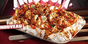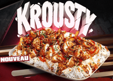 Filet de poulet croustillant, accompagné d'un riz blanc parfumé et de sa sauce secrète krousty. Le tout parsemé d'oignons frits et d'un zest de sauce chinoise.